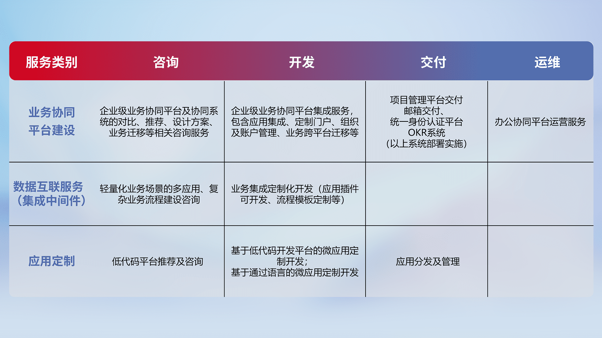针对钉钉、、企微、、、IDaas等平台级产品提供产品的规划、、、方案、、交付、、、、定制化开发等服务,,,,实现如统一协同办公、、、、智能客户服务、、、、混合会议管理、、智能数据查询、、等业务场景,,,实现数字化转型。。