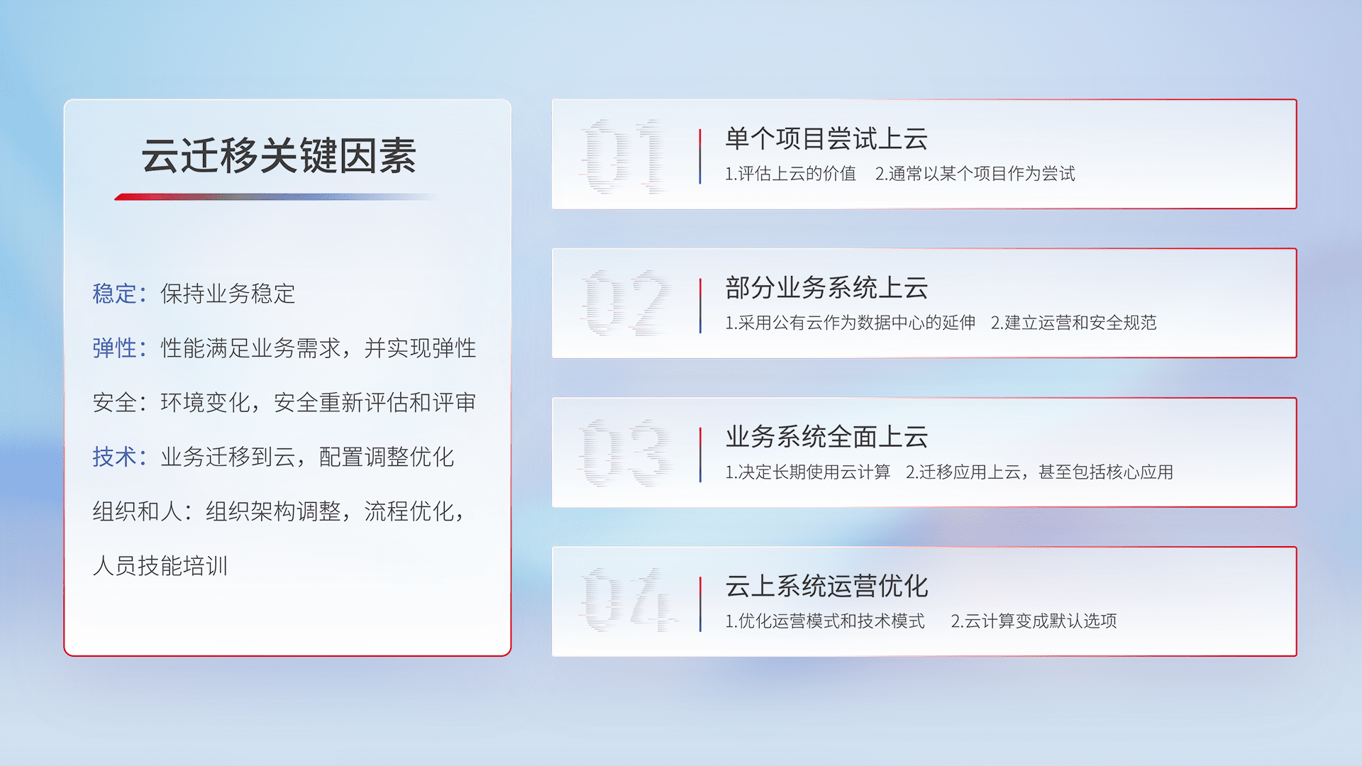 结合实际业务,,,从规划设计、、云平台选型、、、云原生改造、、、数据迁移、、集成交付,,,迁移全过程为客户识别最佳上云路径,,,,做好风险识别管理,,,设计网络架构、、、、身份权限、、安全审计合规、、、操作审计、、、、日志审计、、、监控告警策略、、多站点容灾设计等,,,,对云上基础设施进行整体规划,,,,提升IT治理水平,,,以满足弹性、、、高可用、、高性能的需求。。。
