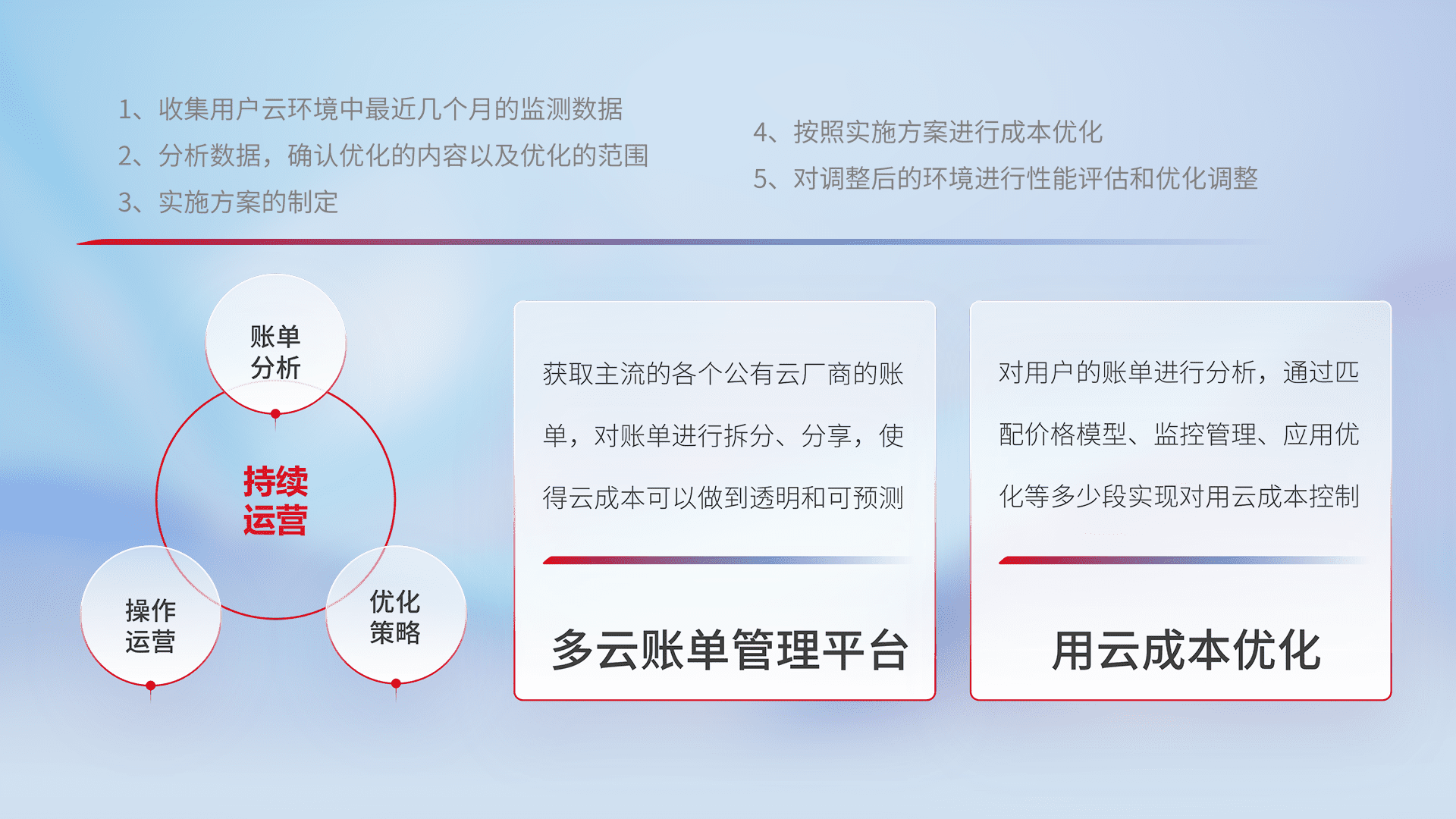 通过多云纳管,,以统一的资源数据模型把客户的云资源进行抽象和封装,,,进而实现对多云资源的统一操作,,保障云资源管理的可靠性、、稳定性与可用性。。。量身定制化运维内容,,,,配置、、、、开发运维、、补丁管理、、备份、、监控、、认证和访问管理、、、、审计和日常巡检等,,保障在用云过程中的可靠度,,稳定度以及高可用率。。。。