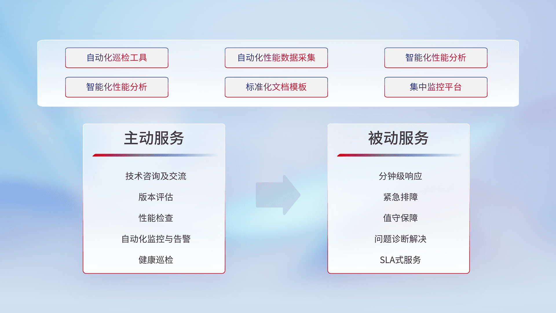 智能化工具和标准化文档,,保障服务质量,,,,提供主动服务(包含技术咨询、、、、版本评估、、、、性能检查、、自动化监控与告警、、、健康巡检)和被动服务包含(分钟级响应、、紧急排障、、、值守保障、、问题诊断解决、、SLA服务)。。